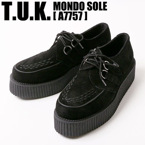 - T.U.K.'s classic black suede Mondo Hi soled traditional brothel creeper Round toe with a Hi 4cm ribbed sole A black round Interlace design running through the toe Traditional stainless steel D-ring's This creeper is unisex sizing, please refer to our size guide. The original T.U.K. Creeper; Classic black on black round toe brothel creeper with a 4cm tall super strong Mondo Hi rubber sole unit. Inspired by a history of music, art & fashion. Express your individuality with this traditional Rock n' Roll look. The style and aesthetic that started T.U.K over 20 years ago remains the same: shoes inspired by a rich history of music, art, and fashion that represent individuality and expression. These styles have been the staple of the underground rock nâ€TM roll music scene for decades and are sought after for their originality and traditional look and feel.